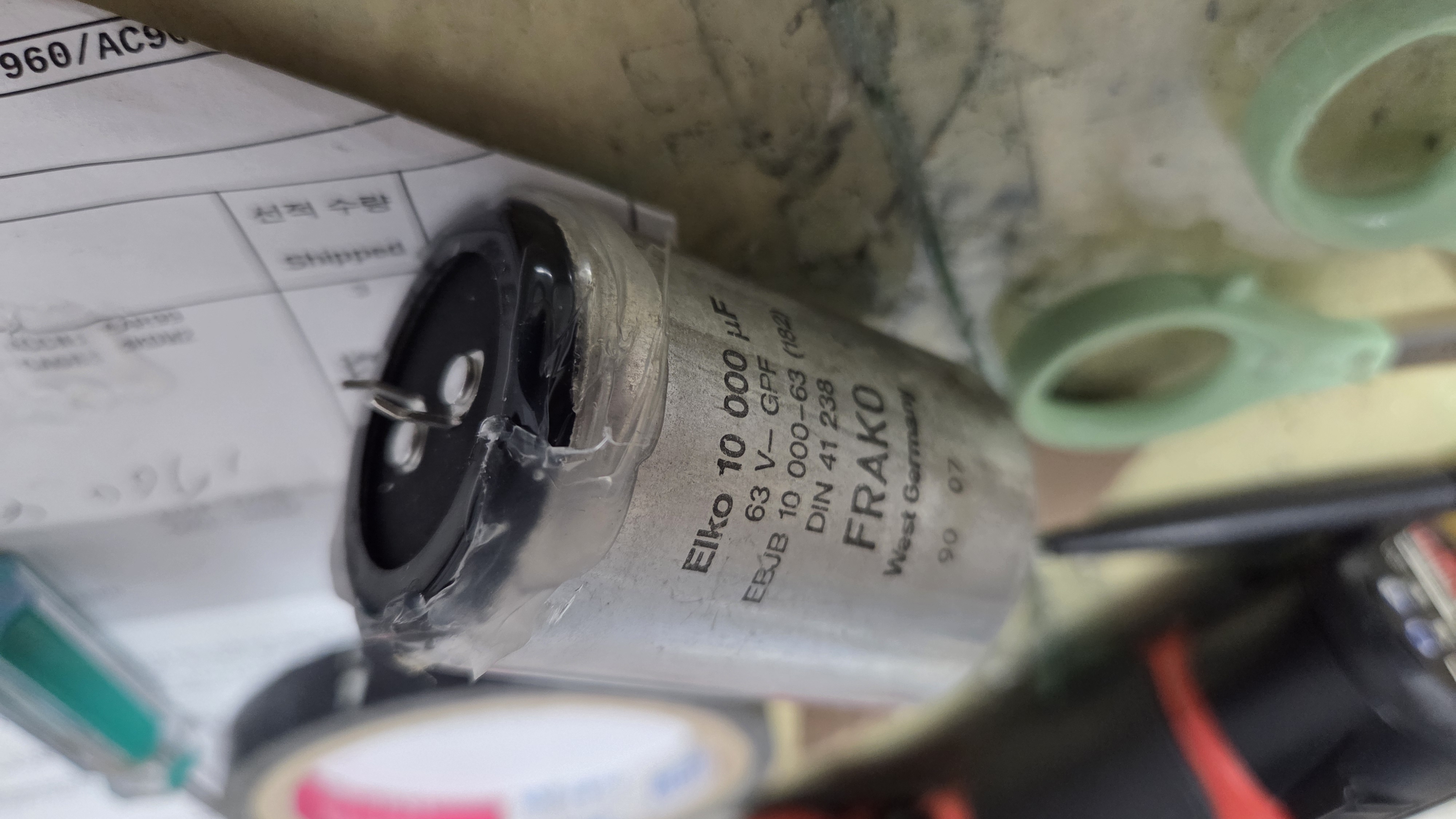 문제는 윗면의 볼트가 있는 신품을 구하기 어려워밑의 사진과 같이 캔의 밑면을 잘라 내용물을 빼내고 새 콘덴서를 넣어 해결 했다.