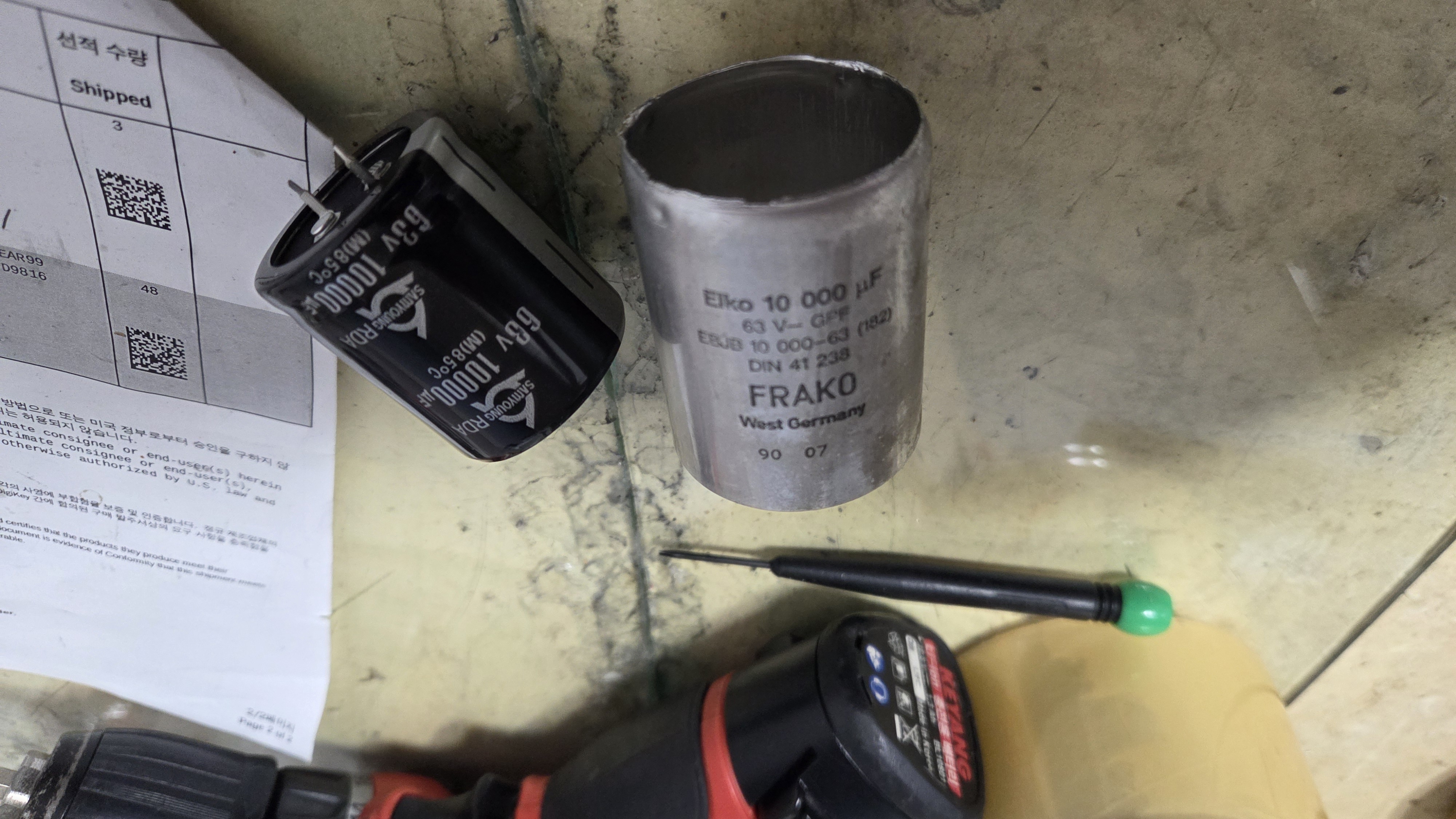 문제는 윗면의 볼트가 있는 신품을 구하기 어려워밑의 사진과 같이 캔의 밑면을 잘라 내용물을 빼내고 새 콘덴서를 넣어 해결 했다.