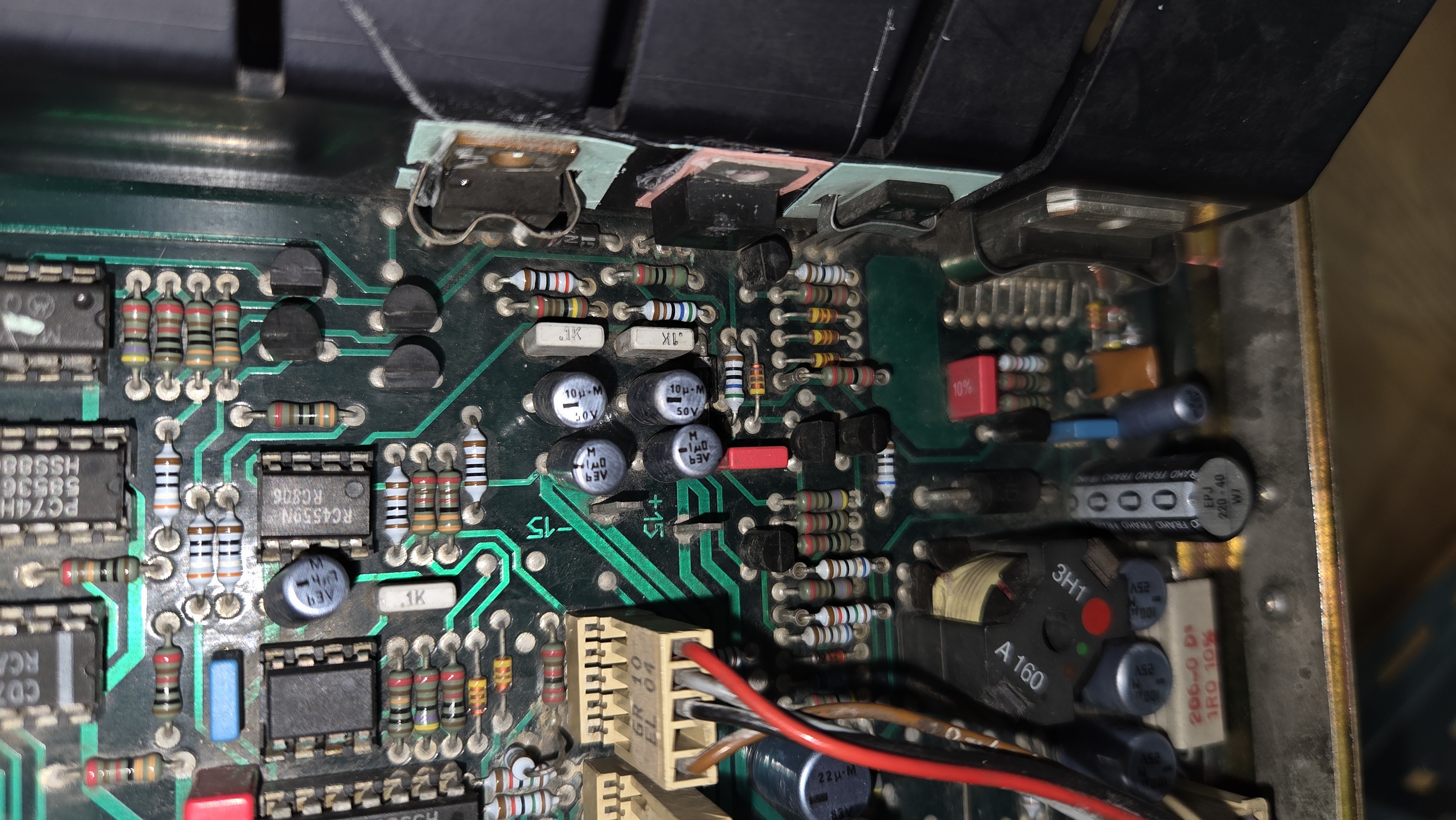 이 보드를 떼어내어 트랜지스터를 점검하고 전해 콘덴서를 교체했다. 그리고 냉납이 발생할 수 있었기 때문에 이 보드에 있는 납땜을 전부 다 다시 해 주었다.