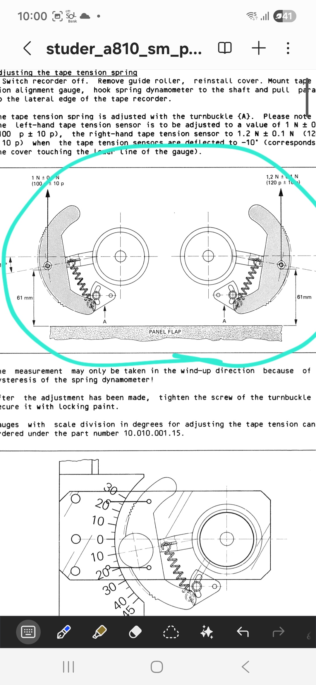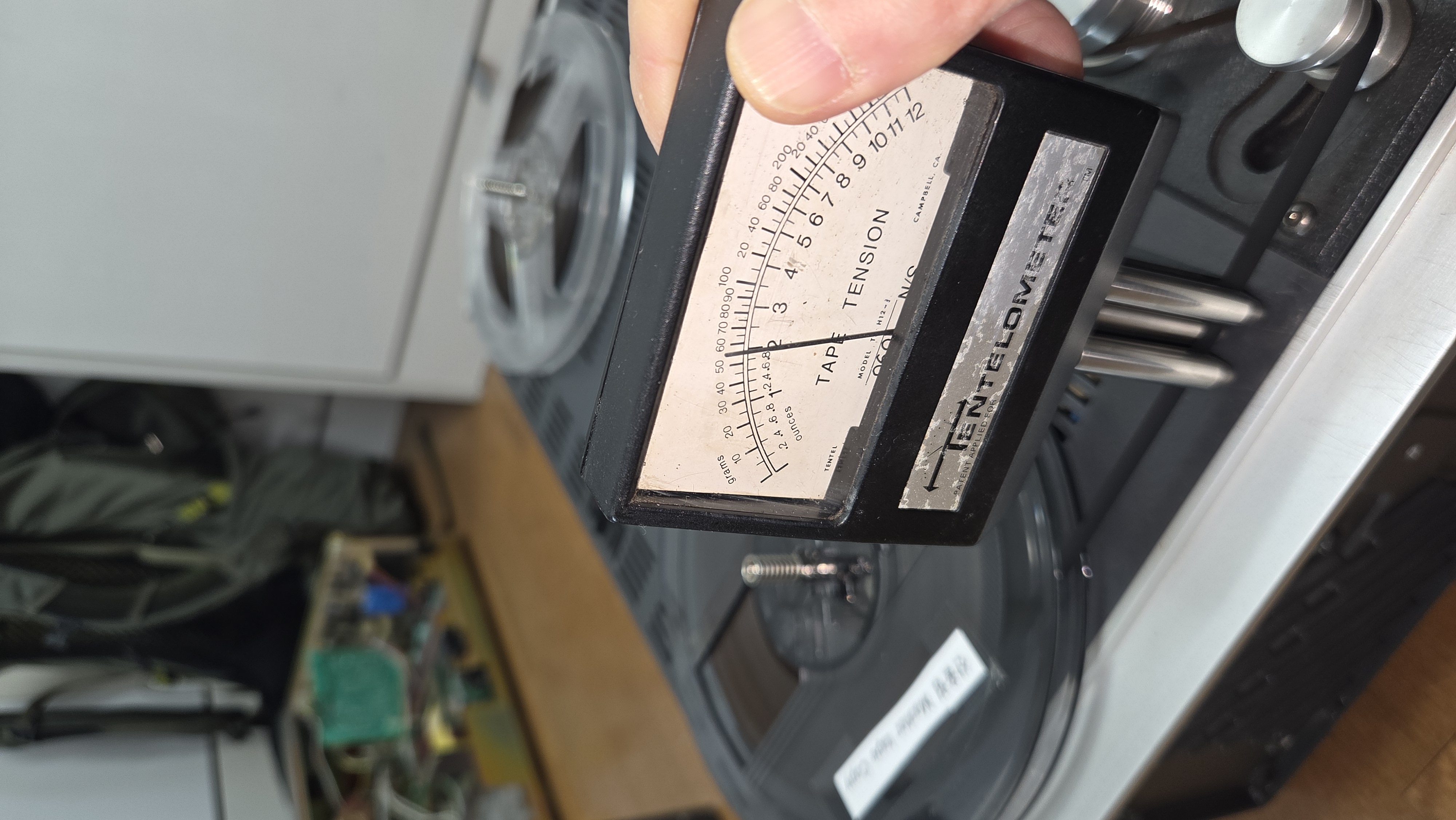 갖고 있는 Tentelometer로 장력을 재어 보니 supply motor의 back tension이 지나치게 높게 되어 있다. 서비스 매뉴얼에 따라 적정 장력이 나오도록 조정하니 이제야 정상적인 속도로 재생이 이루어 진다.