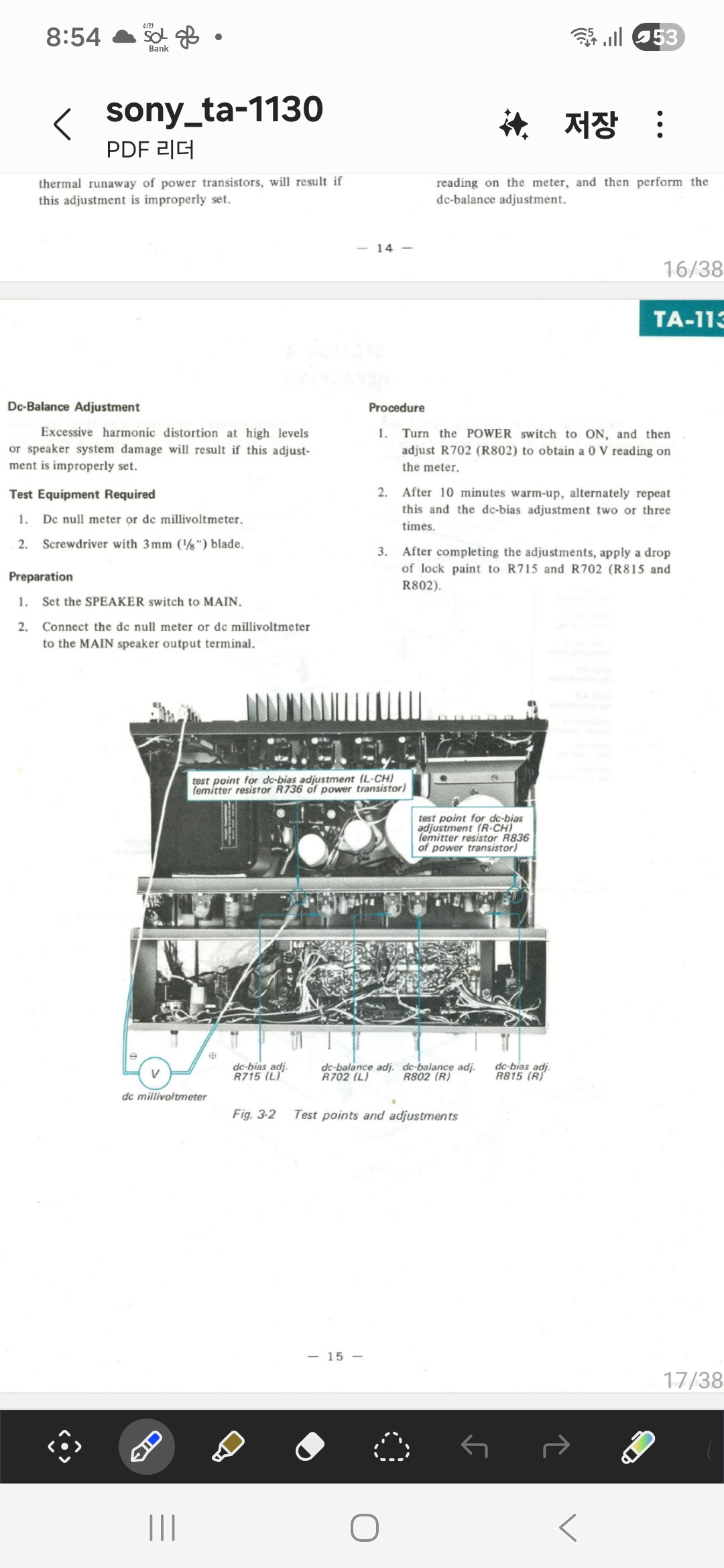 험 잡음이 나온다고 수리를 의뢰 받았는데 스피커 출력단에 0점 조정과 바이어스 전류를 25 mV로 맞추고 났더니 사라졌다. 더 이상의 손 볼 필요가 없을 정도여서 쌓인 먼지 등을 털어내고 조정을 마무리하였다..