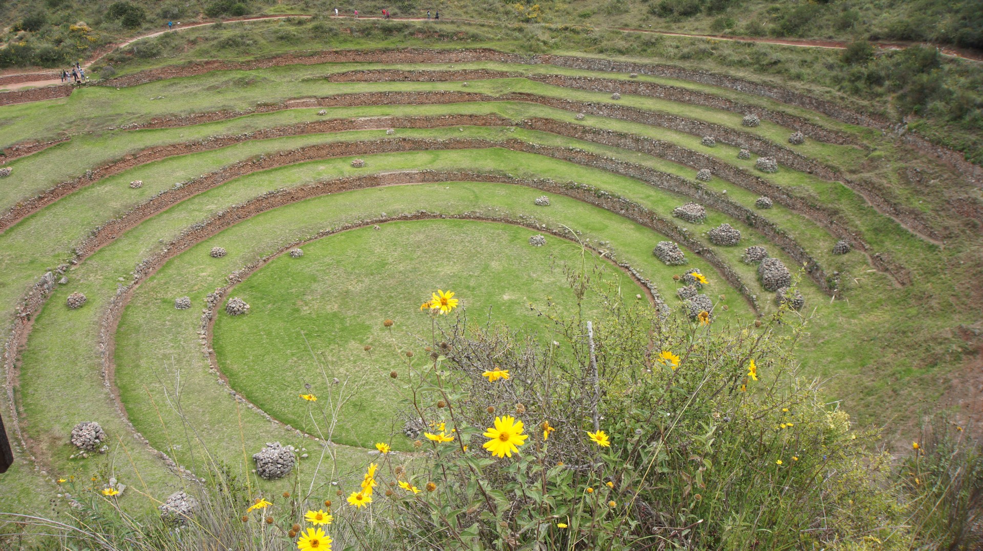 다음으로 찾아 간 곳은 계단식으로 된 잉카인의 농업 시험장이라고 하는 모라이( Moray) 유적지. 원형의 계산식 밭이 층층히 조성되어 있는데 가장 낮은 곳은 깊이 30m 정도라고 한다. 높이 차이는 얼마 되지 않지만 바람, 태양 빛을 받는 환경 등이 달라 이 한 곳에서도 기온 차가 15도 정도나 나서 여러 작물을 시험 재배 할 수 있다고 설명 한다. 초록색으로 된 원형 유적지의 느낌이 꽤 강렬하게 느껴졌다.