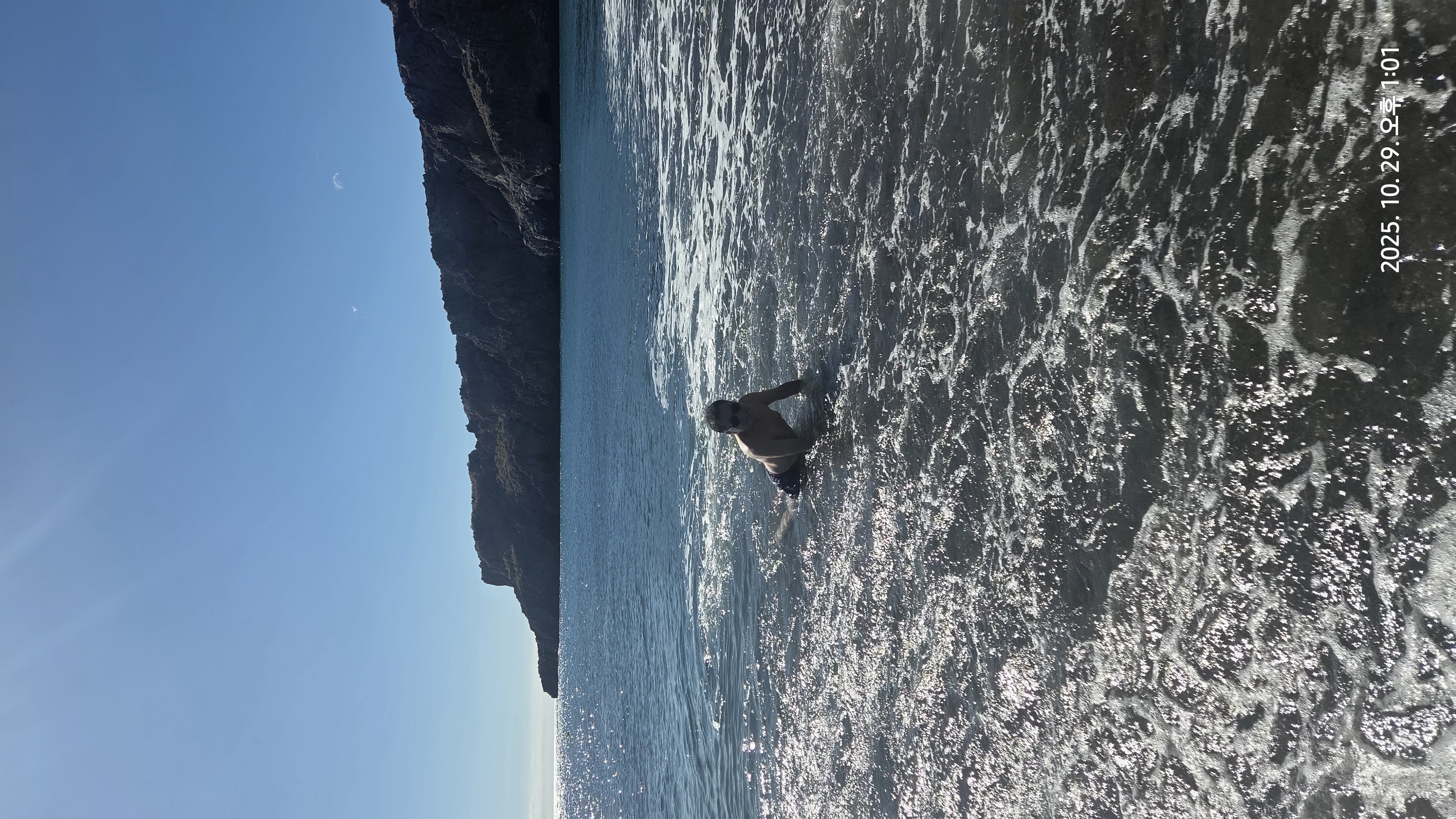 바닷물이 여름날 동해안 해수욕장 정도의 수온.